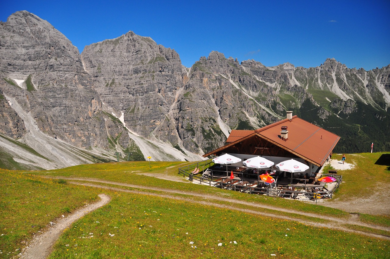 ここからチルマッハ小屋(1936m)/Zirmachalmまでは、さらに約3-40分ほどよく整備された道を下ってゆきます。さらにカルクコーゲルの山側迄行きそこから右に方向を変え、自然教育の道/Naturlehrwegと言われる道を45分~1時間ほど下りシュリッカー・アルム(1643m)/Schlikeralmに到着します。この道は家族連れなど子供たちが楽しめるよう、野生動物たちの写真や説明がある看板など、いろいろと自然を学べるように工夫されています。シュリッカー・アルムはこの辺りで最も大きなアルムで、家族連れなどでとても賑わっています。朝一番から歩いた場合、ここでランチをするのが最適です。